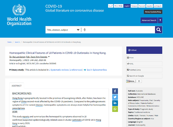 06/05科研出版:香港COVID-19疫情中18例患者的顺势疗法临床特征