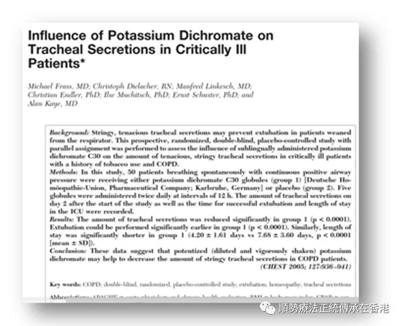 50 个以持续正压通气CPAP自行呼吸、患有慢性阻塞性肺病的加护病房病人,分两组,分别服用重铬酸钾 30C或安慰剂,早晚各五粒,每12小时服用一次。结果显示: