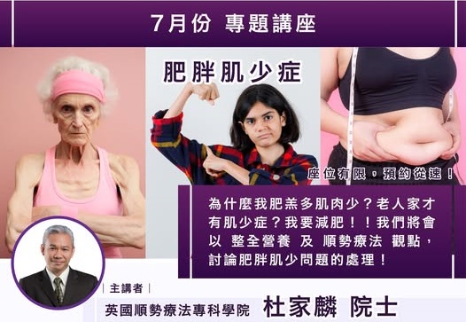 内容:为什么我肥羔多肌肉少? 老人家才有肌少症? 我要减肥!! 我们将会以 整全营养 及 顺势疗法 观点,讨论肥胖肌少问题的处理!
