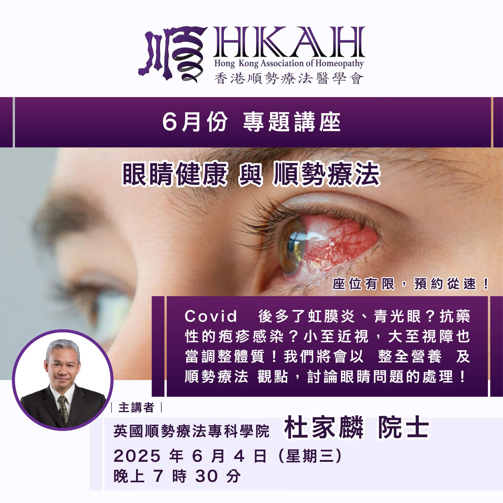 内容:Covid 后多了虹膜炎?青光眼? 抗药性的疱疹感染?小至近视,大至视障也当调整体质!我们将会以 整全营养 及 顺势疗法 观点,讨论眼睛问题的处理!由本医学会会长 --- 杜家麟院士主讲,座位有限,请预先留座!