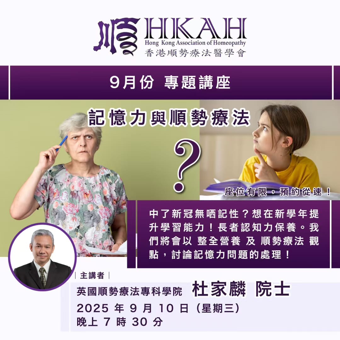 内容:我们将会以 整全营养 及 顺势疗法 观点,讨论记忆力问题的处理!由本医学会会长 --- 杜家麟院士主讲,座位有限,请预先留座!