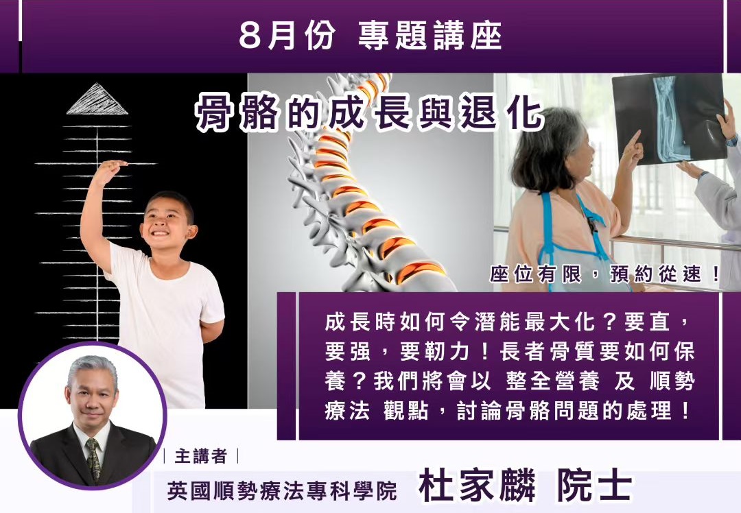 内容:成长时如何令潜能最大化? 要直、要强、要韧力! 长者骨质要如何保养? 我们将会以 整全营养 及 顺势疗法 观点,讨论骨骼问题的处理!