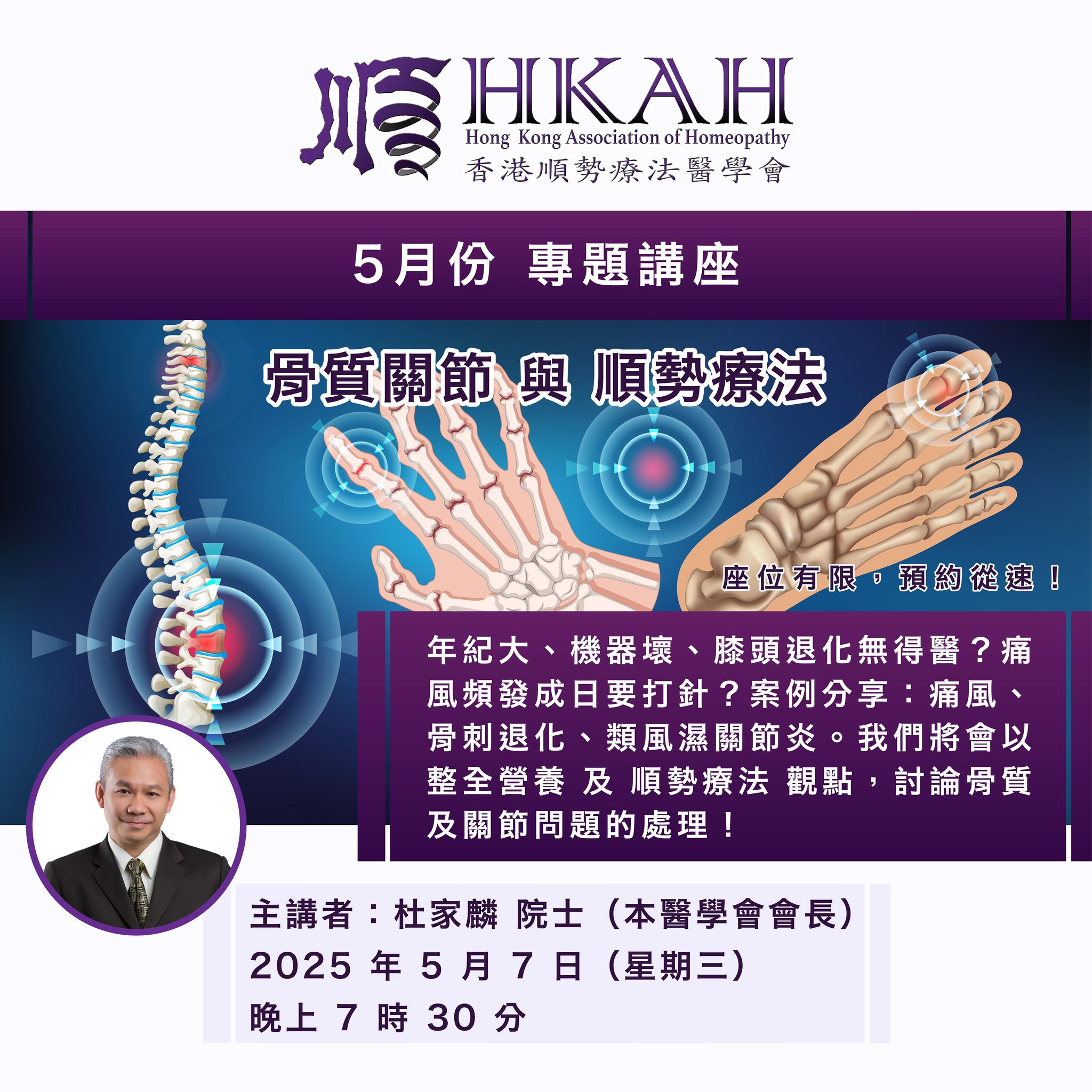 内容:年纪大,机器坏,膝头退化无得医?痛风频发,成日要打针?案例分享:痛风、骨刺退化、类风湿性关节炎、椎间盘突出。我们将会以 整全营养 及 顺势疗法 观点,讨论骨质和关节问题的处理!